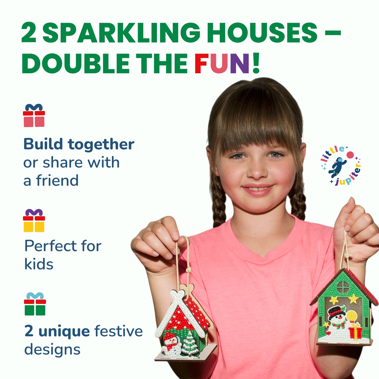 Little Jupiter sets provide kids with the opportunity to unleash their creativity and focus. Our small diamond art kits include two Christmas houses. This easy to build kit displays beautifully on your tree. Just paint by number and tie string to display. Average build time is 45-60 mins per piece. Kids will love the results of their hard work.
