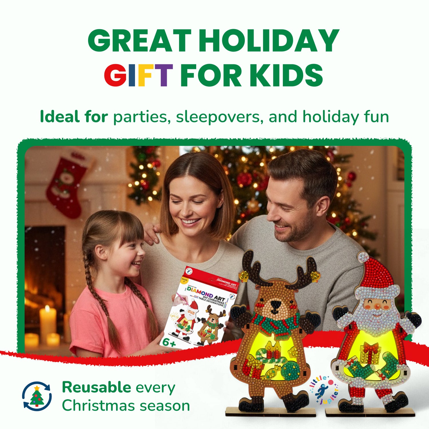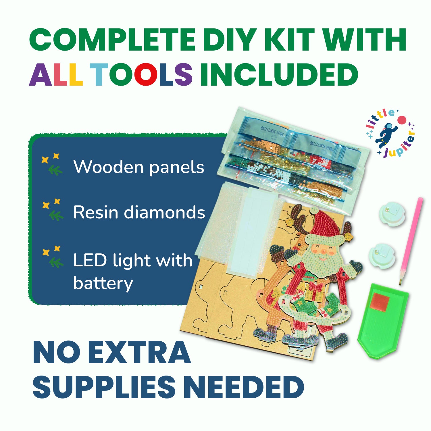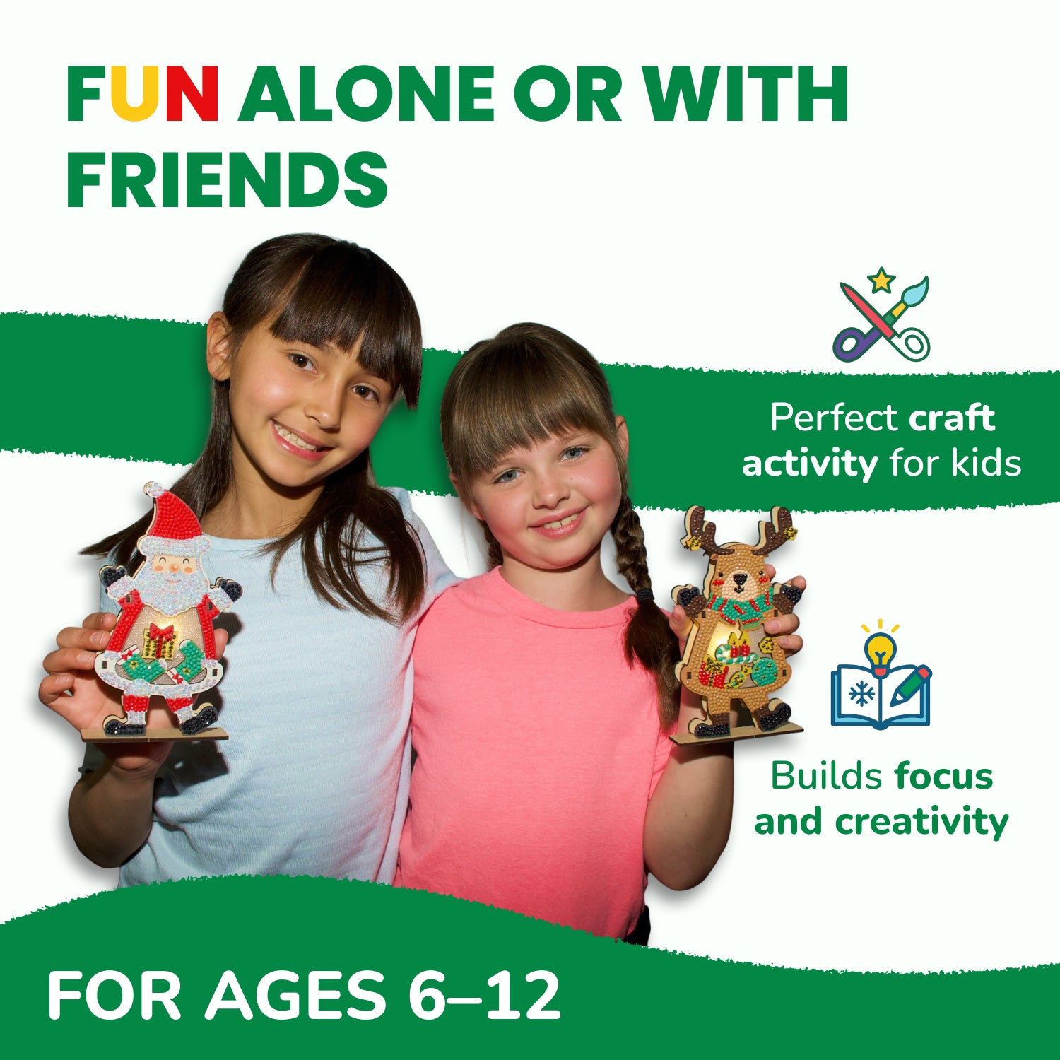 - Ultimate Christmas Crafts Kits: An awesome diamond art kit for children that allows you to build two light up Christmas tabletop diamond art kits. This non-mess craft Includes all pieces, lights, and batteries. Santa and Reindeer included.