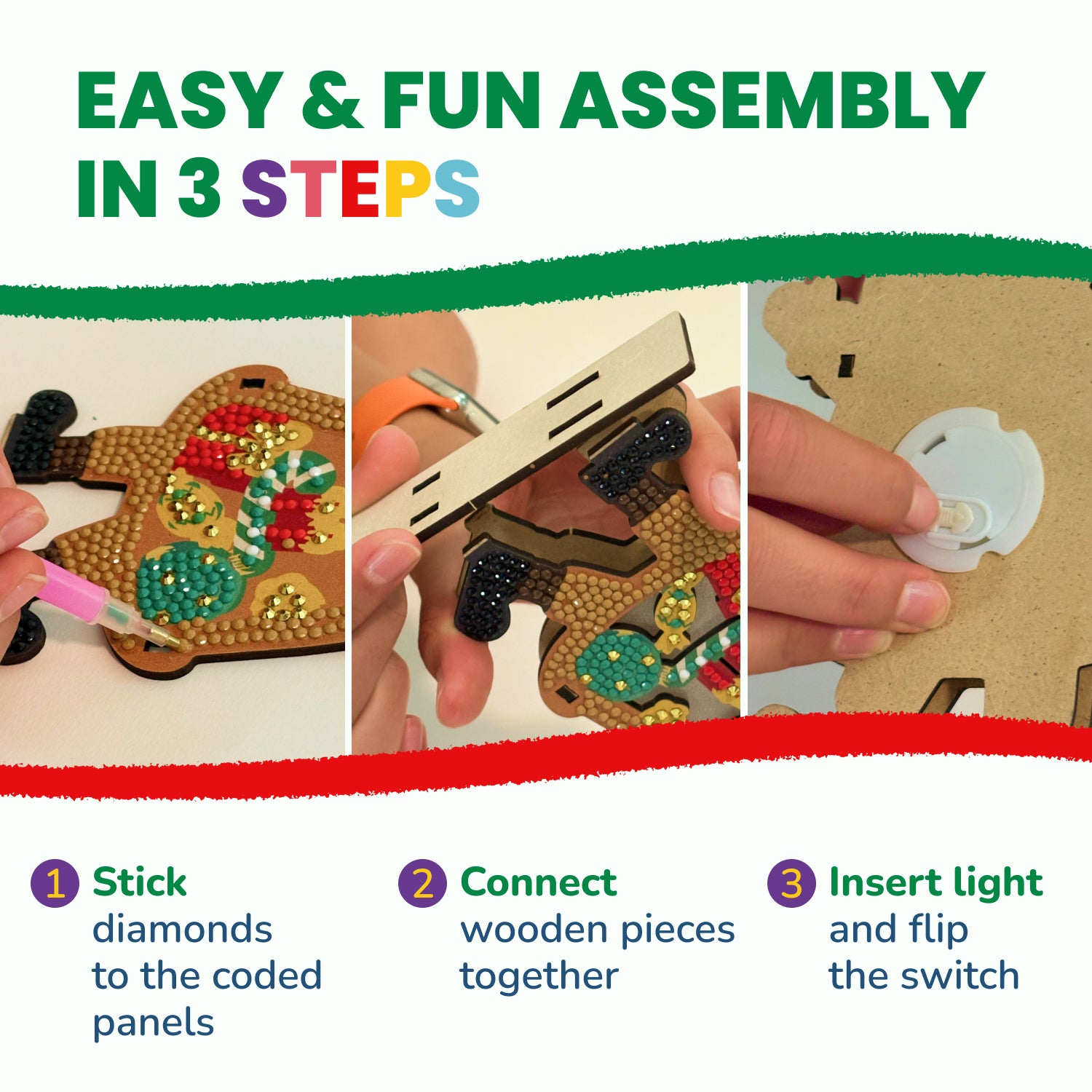 - Complete Diamond Art for Kids : Includes MDF board pieces with printed adhesive gem pattern, resin gem diamonds, LED lights with batteries, jelly glue, pen tool, craft dish, & frosted window plastic. The perfect gem art kit for kids 6-12.