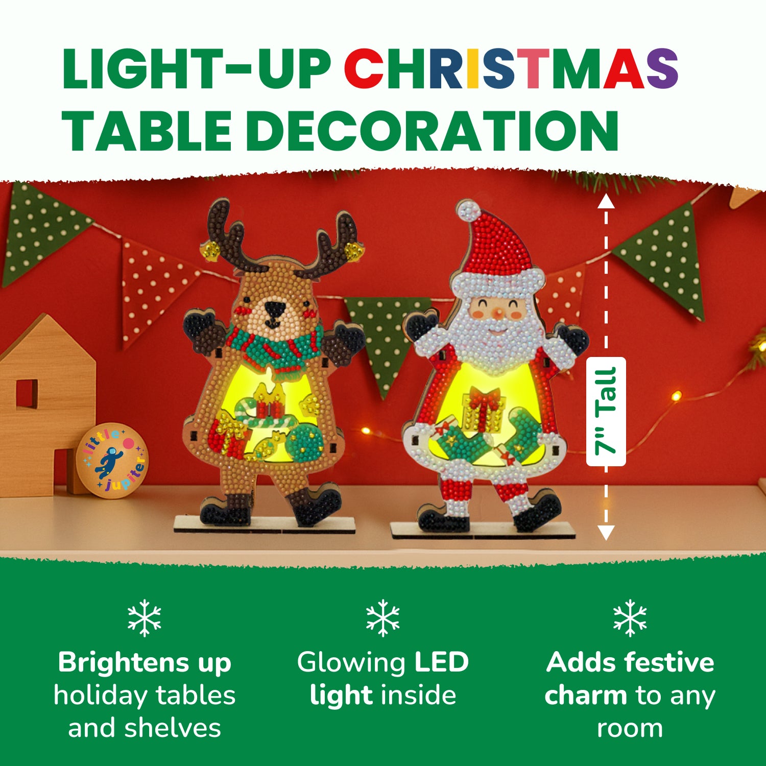 Little Jupiter sets provide kids with the opportunity to unleash their creativity and focus. Our small diamond art kits include two Christmas themed table decorations. This easy to build kit displays beautifully in your living or kids room. Just paint by number and flip the switch to display. Average build time is 45-60 mins per piece. Kids will love the results of their hard work.