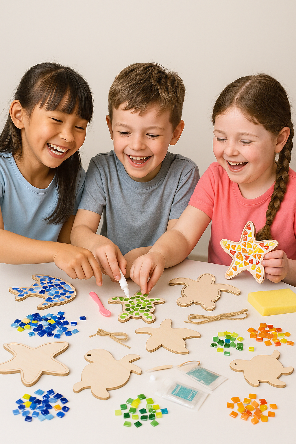 Sea Creature Creations Await: This mosaic kit includes contents to build a fish, sea turtle, starfish, and dolphin. Mosaic crafts are a blast for boys and girls! Keep kids busy for hours. Each masterpiece takes 30+ mins to complete.
