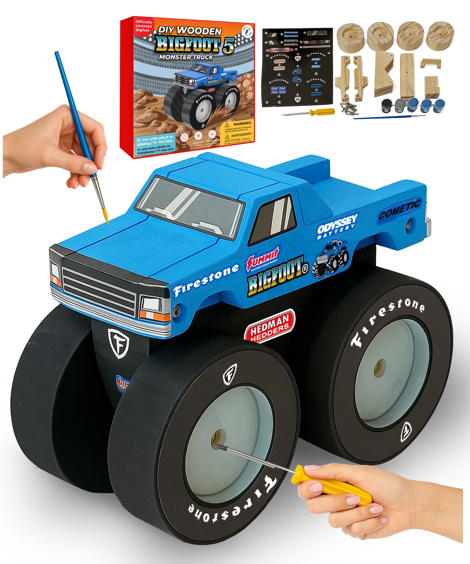 - Build and Paint the Legend: Kids build, paint, and decorate a wooden DIY Bigfoot 5, the 1986 classic monster truck. Children learn real screwdriver skills. Includes precut wood parts, hardware, screwdriver, safe acrylic paint and licensed stickers. Ages 5+ with help or 7+ solo.
